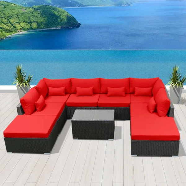 IIOF Outdoor 8 Seater Black Rattan Sectional Sofa Set with Red Cushions IIOF Outdoor 8 Seater Black Rattan Sectional Sofa Set with Red Cushions