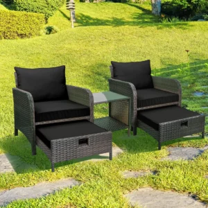 Wicker rattan outdoor lounge chairs with soft cushions, an ottoman, and a glass table create a stylish and comfortable outdoor seating set. Durable wicker weave, plush cushions, and the glass-topped table add both functionality and elegance to any patio or garden.