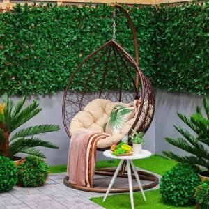 • “STAND AND CUSHIONS ARE INCLUDED: Never worry about maintenance with this hanging chair patio set. The Ratan Wicker and iron swing seater is protected with finishing to resist the suns heat and rain. Our cushions are tough, yet soft with cushioned seating and Ratan Wicker material, your guests can sit back and relax with luxury accommodation. Our cushions are made with moshi cloth and poly fillers for the perfect snug. The chair takes minimal area cover.”